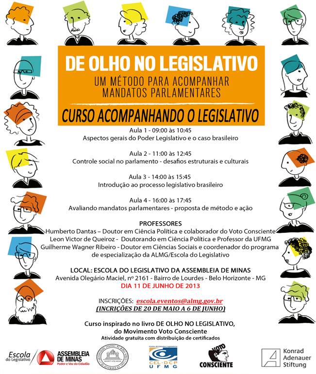 Um panorama sobre o Legislativo no Brasil; noções sobre o processo legislativo; controle social; e metodologias de acompanhamento do Legislativo são os tópicos que serão abordados no curso Acompanhando o Legislativo, a ser realizado no próximo dia 11 de junho, de 9 às 18 horas, na Escola do Legislativo. Os interessados nesta atividade de Educação para a Cidadania poderão efetuar as sua inscrições no período de 20 de maio a 6 de junho, pelo e-mail escola.eventos@almg.gov.br, informando o curso de interesse, o nome completo do participante, instituição ou organização de origem, endereço e telefone para contato.