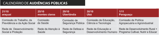 Os encontros regionais serão realizadas em Araçuaí (Jequitinhonha e Mucuri 21/10), Montes Claros (Norte 25/10), Uberlândia (Triângulo 29/10), Ubá (Zona da Mata 30/10) e Paraguaçu (Sul 01/11). Nos dias 4, 5 e 6, as discussões acontecem em Belo Horizonte.