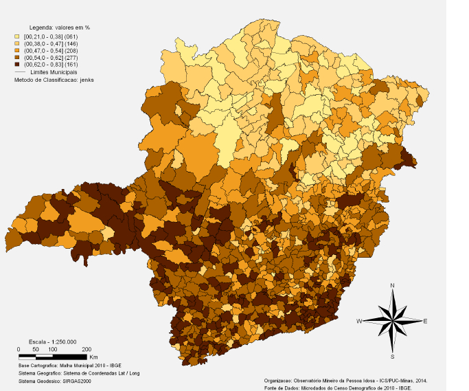 Em Minas Gerais vivem 2,3 milhões de pessoas com mais de 60 anos de idade, número que corresponde a 11,8% da população do Estado. O ICVI-MG vai de 0 a 1, sendo que, quanto mais próximo do índice 1, melhor a condição de vida do idoso. No mapa, as localidades com melhor índice estão coloridas em marrom, enquanto que aquelas com piores índices estão em amarelo claro.
