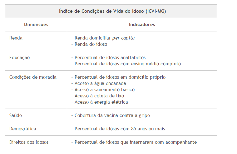 Levando essas dificuldades em conta, foram definidos 12 indicadores, distribuídos em seis dimensões, para medir a qualidade de vida das pessoas com 60 anos ou mais no Estado: