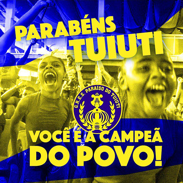 A Tuiuti foi a vice-campeã do carnaval carioca e primeira colocada no coração dos brasileiros, ficando com o título de “Campeã do Povo”. Nesse sábado, 17/02, acontecerá na Marquês de Sapucaí o desfile das campeãs, com o ato Ocupa Sambódromo: Desfile da Campeã do Povo; saiba mais: HTTPS://GOO.GL/SJES7A