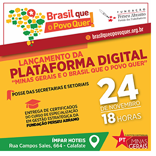 Lançam, nessa sexta-feira (24/11), às 18h, a plataforma “Minas Gerais e o Brasil que o povo quer”. O objetivo é colher propostas e demandas dos cidadãos para servir de base ao programa de governo do PT para 2018. Em debates, através dos Setoriais, as questões serão aprofundadas. Com esse instrumento, já lançado em nível nacional, a sociedade pode optar, falar e sugerir as diretrizes que são centrais para um novo projeto de nação.