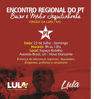 O Partido dos Trabalhadores promove neste domingo, na cidade de Virgem da Lapa, um Encontro Regional do Médio e Baixo Jequitinhonha, que reunirá lideranças locais e estaduais para debater a conjuntura e a candidatura do ex-presidente Lula, que será registrada no dia 15 de agosto, em Brasília, com grande mobilização popular.