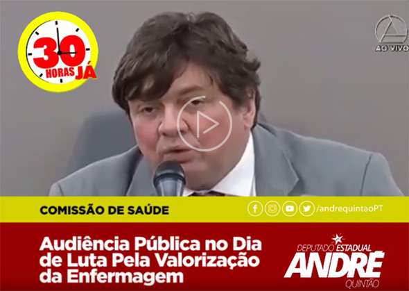No Dia Nacional da Valorização da Enfermagem, celebrado a 17 de maio, a Comissão de Saúde da Assembleia realizou audiência pública, que marcou a data com um debate sobre as reivindicações dos profissionais do setor: a jornada de 30 h e o piso salarial nacional da categoria. O deputado André Quintão participou da audiência e lembrou a luta vitoriosa dos assistentes sociais, sua profissão, que conseguiram aprovação de Lei Nacional fixando a jornada de 30h.