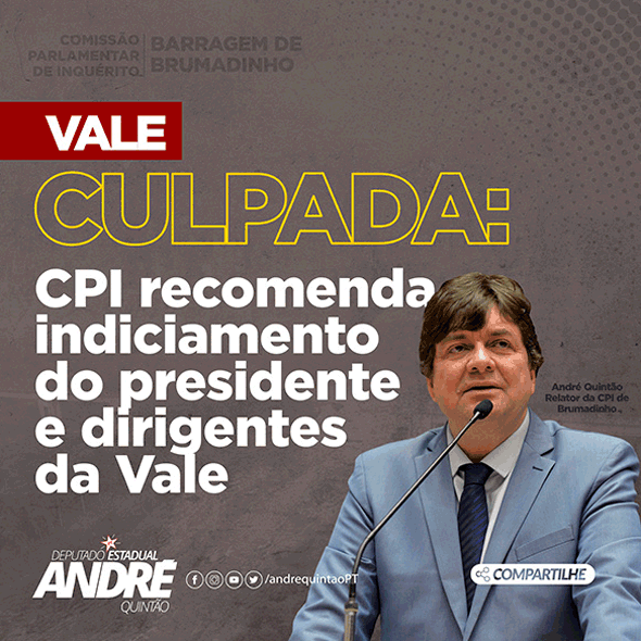 O relator, deputado André Quintão, leu por uma hora a síntese do Relatório, que pede à Polícia Federal e Civil e ao Ministério Público o indiciamento de 11 dirigentes e funcionários da Vale, inclusive seu ex-presidente Fábio Schwartzman, por homicídio doloso eventual, e de dois funcionários da empresa Tüv Süd, Makoto Namba e Jum Yassuda, que assinaram Declarações de Estabilidade da Barragem, em junho e setembro de 2018, com fator de segurança abaixo do parâmetro internacional e da própria Vale nas demais barragens. Além do crime de falsidade ideológica, é preciso que os órgãos competentes aprofundem as investigações porque o laudo forjado foi entregue a órgãos públicos e pode configurar crime de corrupção, afirmou André.