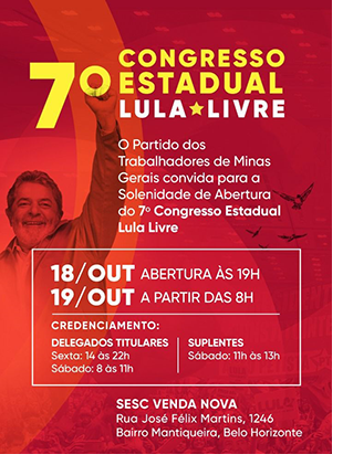 O Partido dos Trabalhadores abre nesta sexta-feira, às 19h, em Belo Horizonte, no SESC Venda Nova, o 7º Congresso Estadual – Lula Livre. Na abertura, serão debatedores o ex-ministro Luiz Dulci e o economista Markus Sokol. Os trabalhos prosseguem no sábado, durante todo o dia, com apresentação das teses, votação e eleição do presidente e do novo Diretório Estadual do partido em Minas. |