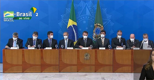 De máscaras, ministros e o presidente Jair Bolsonaro promoveram na tarde de quarta-feira, dia 18, uma entrevista coletiva sobre o conjunto de ações governamentais contra a pandemia do Coronavirus, procurando marcar uma mudança de postura do presidente, cujas atitudes agressivas contra as orientações básicas da Organização Mundial de Saúde (OMS) para contenção do contágio, e contra os poderes Legislativo e Judiciário, provocaram indignação de diversos segmentos. Contudo, as medidas anunciadas para o enfrentamento do colapso econômico e social que se anuncia foram consideradas insuficientes, sobretudo as destinadas às camadas mais vulneráveis da população. E a postura do presidente não convenceu, fortalecendo e até antecipando a convocação, nas redes sociais, de um “panelaço”, com a participação de antigos apoiadores do governo.