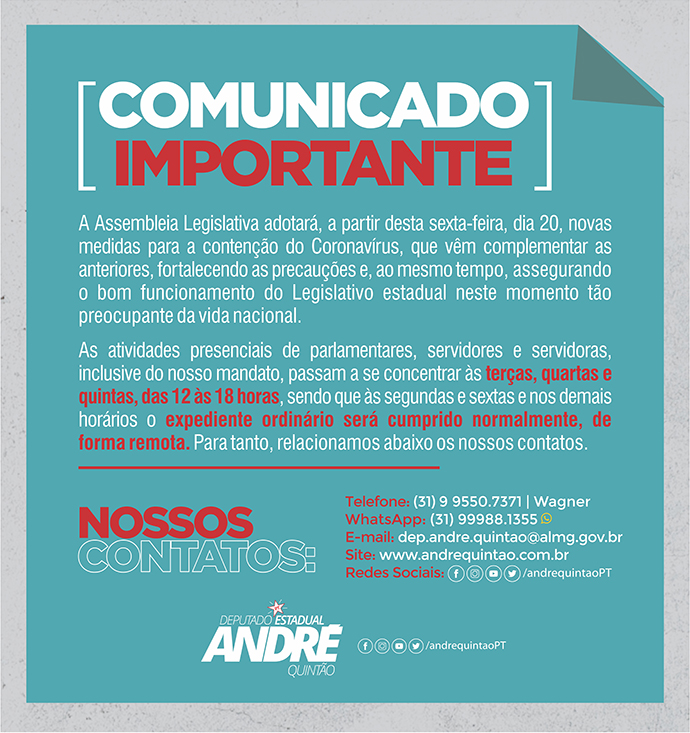 | BOLETIM ELETRÔNICO SEMANAL • DEPUTADO ANDRÉ QUINTÃO • EDIÇÃO N° 509 • 19/03/2020 |