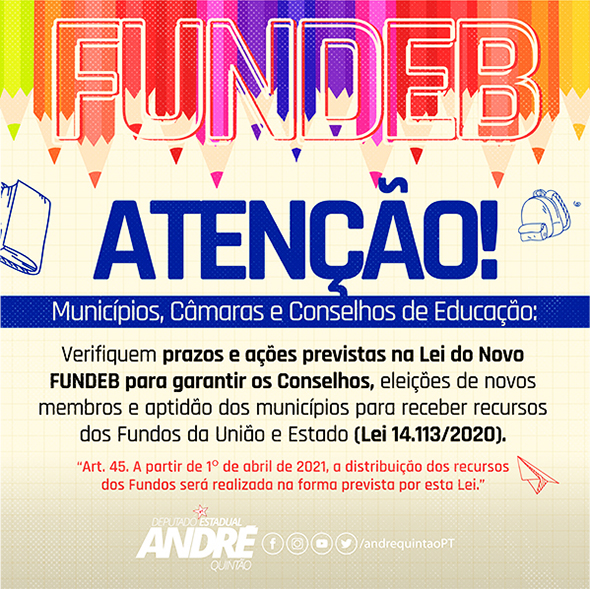 Os gestores municipais têm até o dia 31 de março para instituir os novos Conselhos de Acompanhamento e Controle Social (CACS) do novo FUNDEB. Em vigor desde 1º de janeiro e regulamentado pela Lei 14.113/2020, o novo FUNDEB prevê novos CACs, instituídos por legislação específica. No primeiro trimestre, a repartição de recursos se manteve como no anterior, mas a partir de 1º de abril, valem as novas regras. Em relação aos Conselhos anteriores, a Lei mantém vários dispositivos, inclusive a possibilidade de integrar o CACS ao Conselho Municipal de Educação, mas traz diferenças em relação à duração dos mandatos e composição dos CACS municipais, acrescentando, quando houver, representantes da sociedade civil, escolas indígenas, escolas do campo e escolas quilombolas.