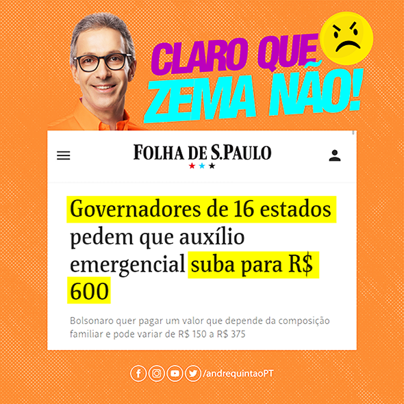 Mais uma vez, o governador de Minas ausentou-se da articulação de governadores, agora em defesa das campanhas pelo Auxílio Emergencial de R$ 600,00, com os mesmos critérios de 2020, em substituição ao previsto pelo Governo Federal, que varia de R$ 150 a R$ 350. Governadores de 16 Estados divulgaram uma Carta nesta quarta-feira, dia 24, em que apóiam as reivindicações da “Campanha Renda Básica que Queremos”, organizada por 300 organizações da sociedade civil, e solicitam “as providências necessárias para garantir segurança de renda à população, associada às medidas de distanciamento social, essenciais para serem adotadas neste momento de intenso aumento de casos e mortes decorrentes da Covid-19”. Entre os que assinam a Carta, estão os governadores dos estados do Nordeste, do Pará, Espírito Santo, Rio Grande do Sul, São Paulo e mesmo do Paraná, Ratinho Júnior, próximo a Bolsonaro.