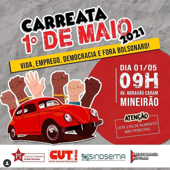 A classe trabalhadora de Belo Horizonte vai ocupar as ruas em carreata neste domingo, dia 1º de Maio, em luta pela manutenção dos seus direitos, pela vida, pela vacina, em defesa dos empregos, da renda, do SUS, da democracia, contra as privatizações e por #ForaBolsonaro #ImpeachmentJá #Por um Brasil feliz de novo.