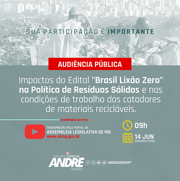 Por iniciativa do deputado André Quintão, atendendo pedido do Movimento Nacional dos Catadores de Materiais Recicláveis (MNCR), entidades ambientais, de pesquisa e de engenharia sanitária, a Comissão do Trabalho realiza nesta segunda-feira, dia 14, às 9h, audiência pública para debater o Edital de Chamada Pública publicado no dia 17 de maio, no Diário Oficial, com vistas à seleção de projetos para a gestão de resíduos sólidos em Minas. A audiência será remota, com transmissão ao vivo pela TV Assembleia e redes sociais.