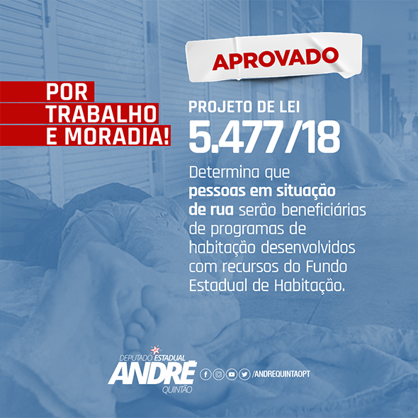 André foi um dos proponentes e coordenou o Fórum Técnico, realizado pela Assembleia em 2018, reunindo entidades, movimentos sociais e moradores de rua em debates em diversas regiões do Estado. Além deste PL, já foi transformado na Lei 23.756/2021 outra proposta do Fórum Técnico que estabeleceu nas diretrizes da Política de Habitação prioridade no desenvolvimento de programas habitacionais para pessoa em situação de rua.