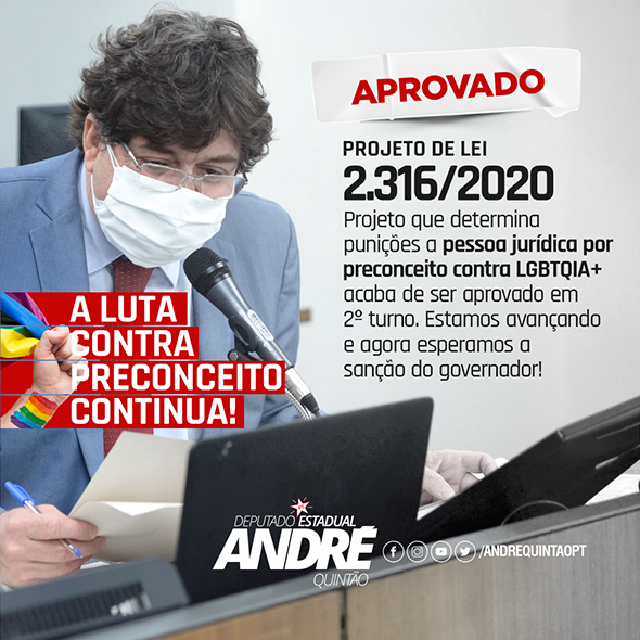 Foi aprovado nesta semana, em 1º e 2º turnos, o Projeto de Lei 2316/2020, de autoria do deputado André Quintão, que prevê sanções a empresas que discriminarem pessoas por sua orientação sexual, identidade de gênero ou expressão de gênero.