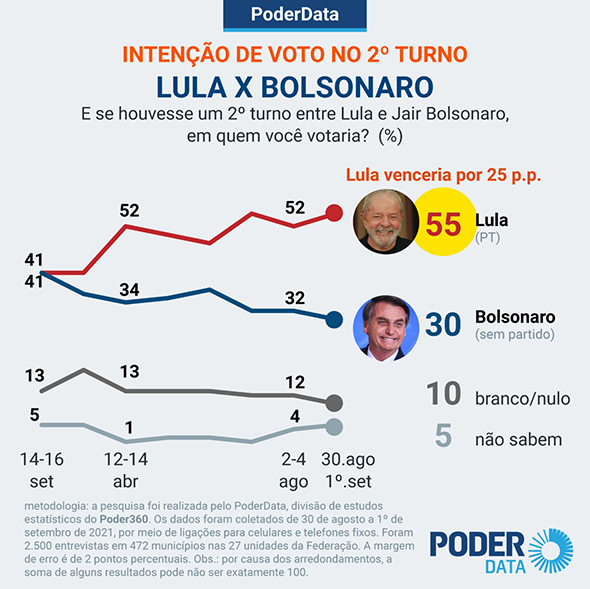 Mais uma pesquisa de opinião mostra que crescem as vantagens do ex-presidente Lula e as esperanças do povo brasileiro nas eleições de 2022. Divulgada nesta quinta-feira, dia 2, a pesquisa do PoderData realizada de 30 de agosto a 1º de setembro apurou que, se as eleições fossem hoje, 55% votariam em Lula em um eventual 2º turno, contra 30% que escolheriam o atual presidente, uma diferença de 25 pontos percentuais. No início de agosto, o mesmo instituto registrou diferença de 20 pontos.